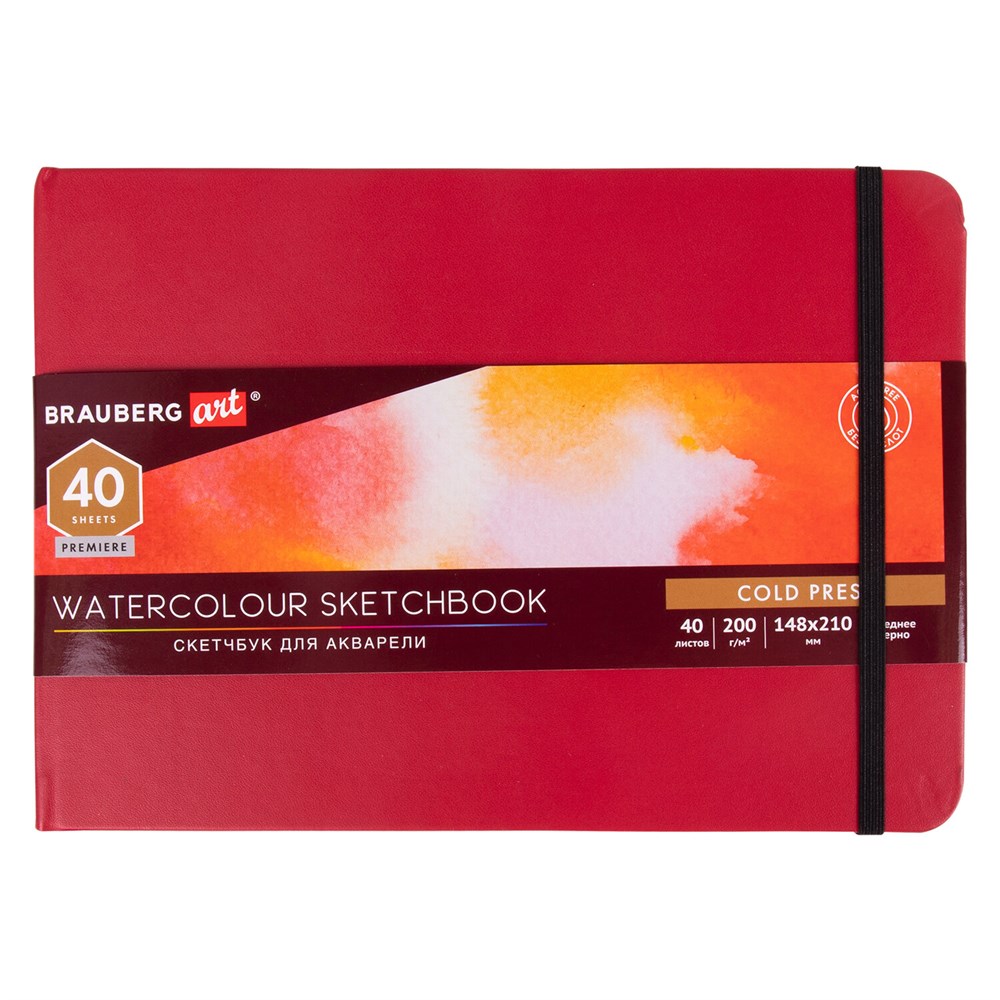 Скетчбук для акварели, 200 г/м2, 148х210 мм, среднее зерно, 40 л., КОЖЗАМ, резинка, BRAUBERG ART PREMIERE, 113265