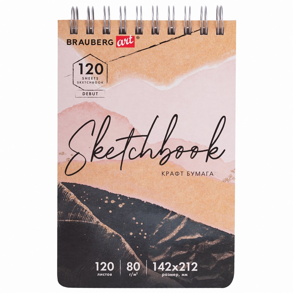 Скетчбук BRAUBERG ART "DEBUT" для эскизов и графики. Внутренний блок - специальная художественная гладкая крафт-бумага коричневого оттенка. Подходит для работы с широким спектром графических материалов (уголь, соусы, карандаши и прочие).Привлекательная обложка выполнена из твердого переплетного картона. В скетчбуке 120 листов крафт-бумаги плотностью 80 г/м2, т.е. 120 возможностей воплотить свою задумку! Листы удобно скреплены спиралью - это позволяет переворачивать их на 180 градусов. Задняя подложка жесткая, что позволит делать зарисовки и наброски "на весу". Удобный формат размером 142х212 мм.