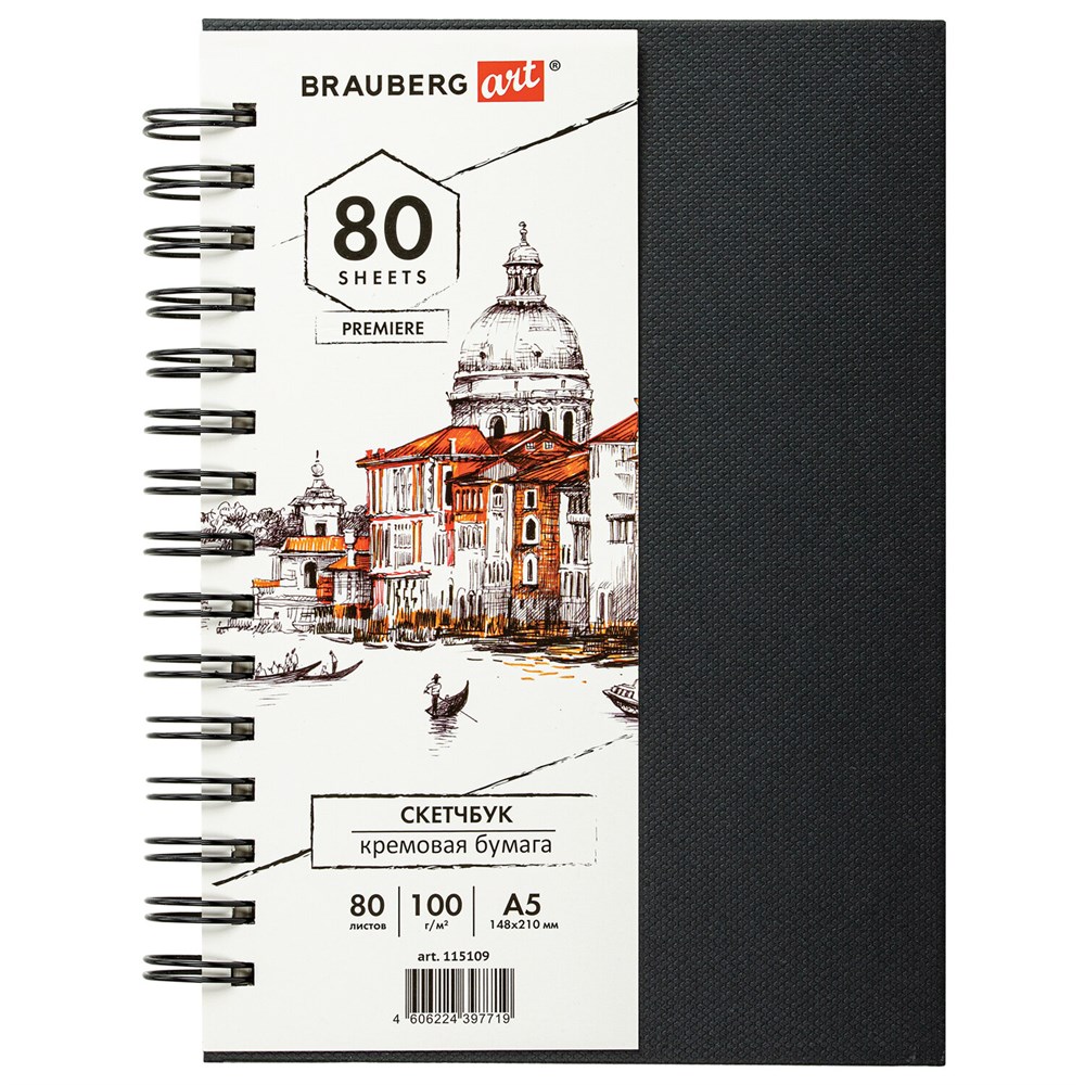 Скетчбук, слоновая кость 100 г/м2, 148х210 мм, 80 л., гребень, твердая обложка, BRAUBERG ART PREMIERE, 115109