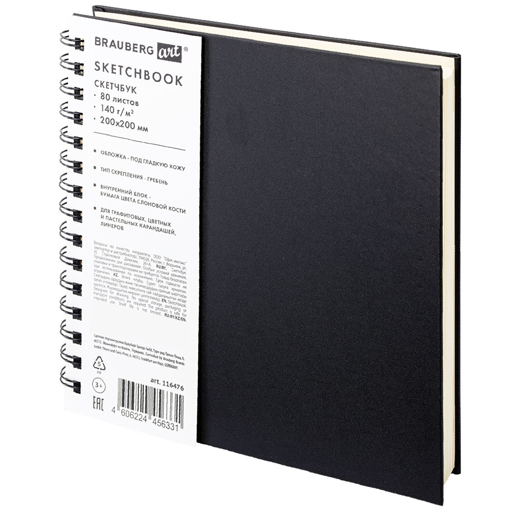 Скетчбук, слоновая кость 140 г/м2 200х200 мм, 80 л., КОЖЗАМ, гребень, BRAUBERG ART CLASSIC, черный, 116476