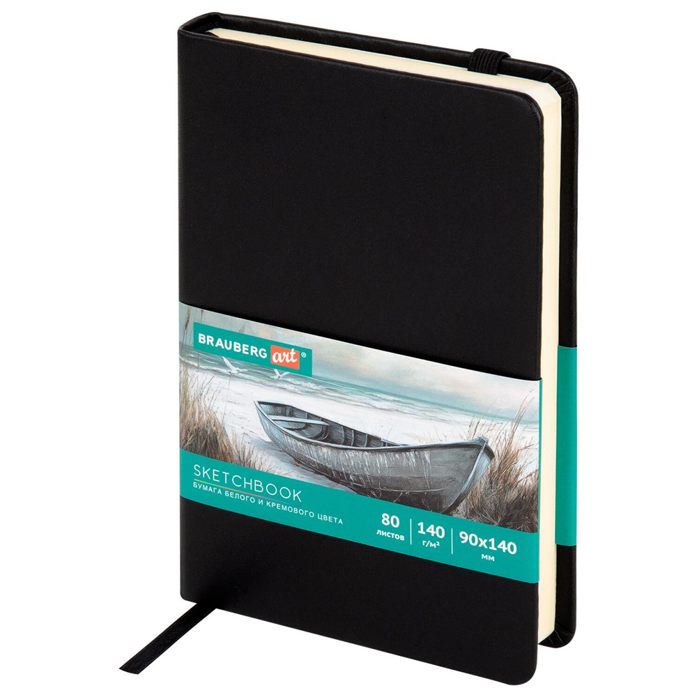 Скетчбук, слоновая кость+белая 140 г/м2, 90х140 мм, 80 л., КОЖЗАМ, резинка, BRAUBERG ART CLASSIC, черный, 116871