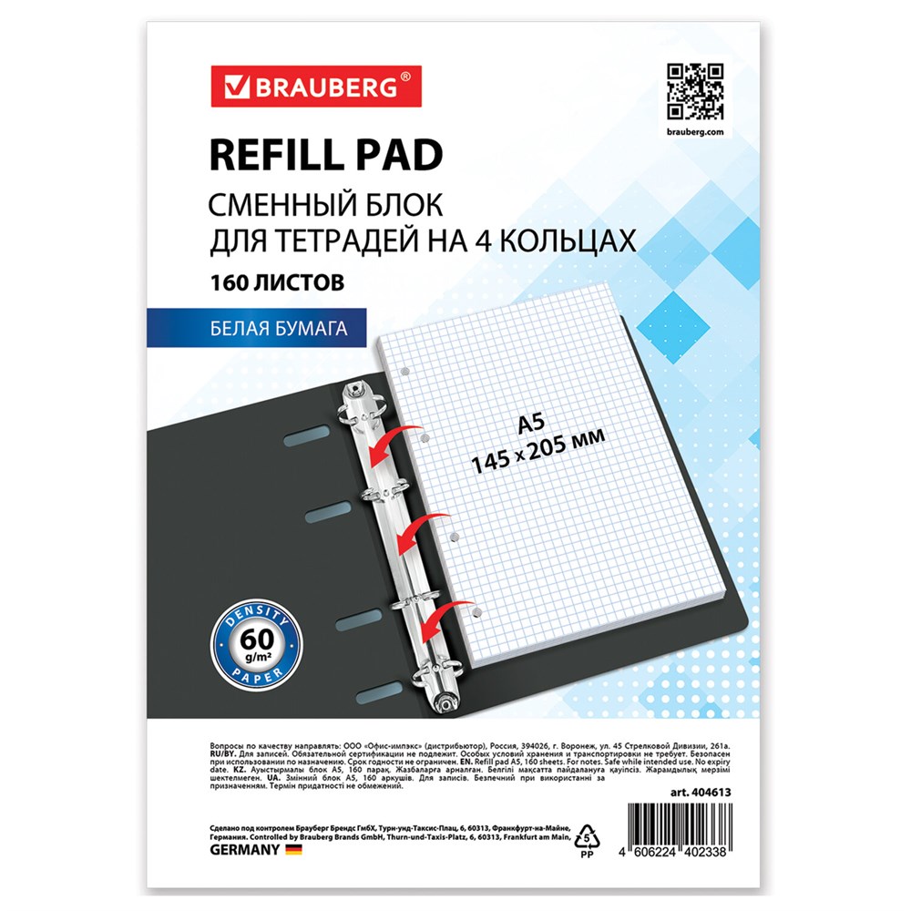 Сменный блок для тетради на кольцах А5, 160 л., BRAUBERG, "Белый", 404613
