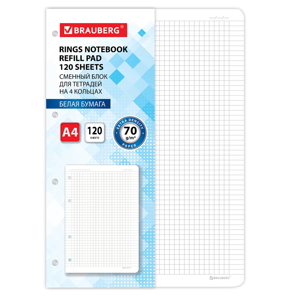 Сменный блок для тетради на кольцах БОЛЬШОЙ ФОРМАТ А4 120 л., BRAUBERG, ПОВЫШЕННОЙ ПЛОТНОСТИ, белый, 404516