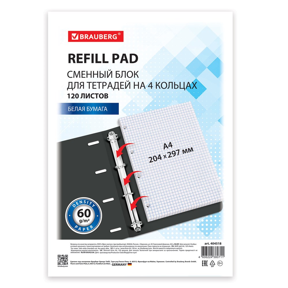 Сменный блок к тетради на кольцах БОЛЬШОГО ФОРМАТА А4, 120 л., BRAUBERG, Белый, 404518
