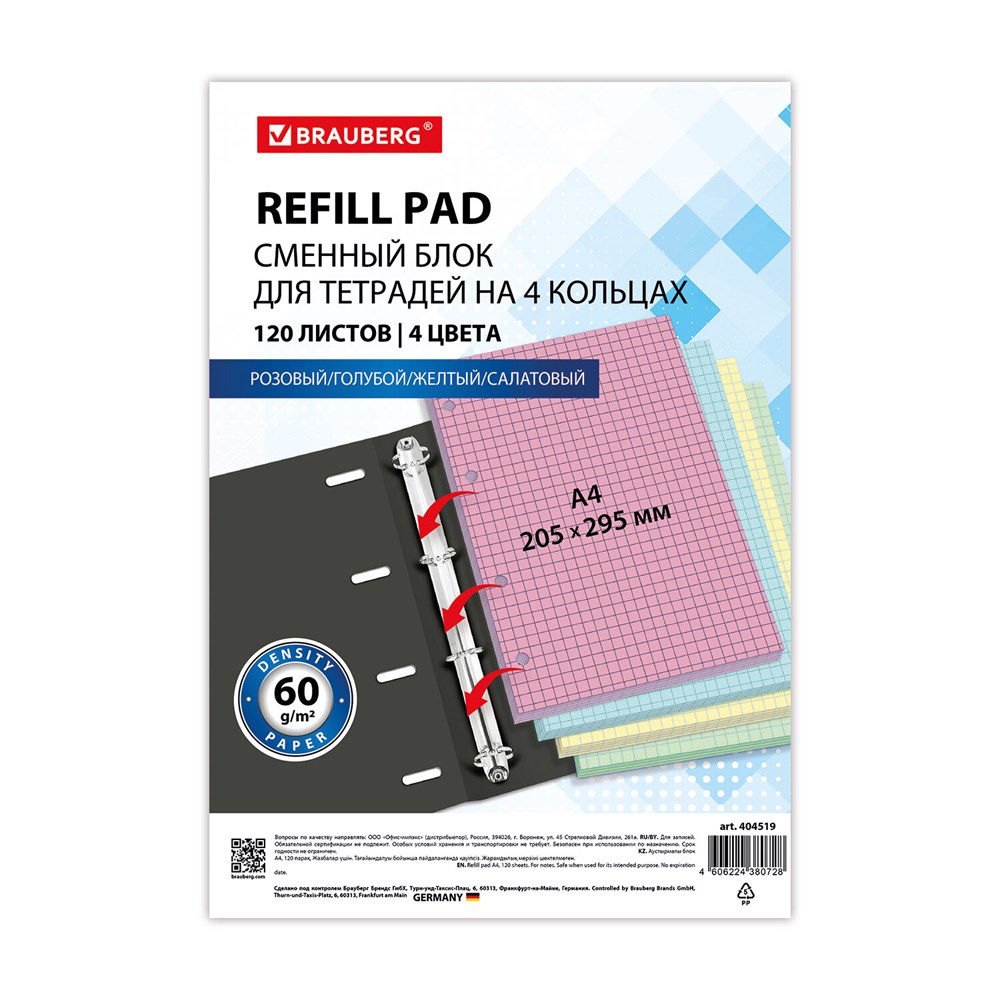 Сменный блок BRAUBERG предназначен для письма гелевыми, шариковыми, капиллярными и перьевыми ручками. Универсальная перфорация на 4 отверстия.Сменный блок подходит для всех тетрадей на 4 кольцах формата А4. Внутри – 120 листов офсетной бумаги плотностью 60 г/м2 с линовкой в клетку без полей. Листы представлены в четырех цветах – розовом, желтом, голубом и зеленом (по 30 листов каждого), что позволяет выбирать оттенок под настроение.