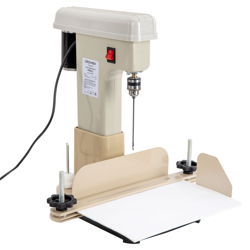 Станок для архивного переплета CROMEX "M168-3" – надёжное решение для обеспечения бесперебойного делопроизводства. Обеспечивает прочный и аккуратный переплёт на нить в соответствии с ГОСТ и законодательством. Идеален для офиса и архива.Принцип работы станка для архивного переплета документов CROMEX "M168-3" заключается в совмещении процесса сверления пачки бумаги (тома) с помощью шила с режущей кромкой и протягивания нити сквозь образовавшееся отверстие. При этом существует возможность использования обычного сверла диаметром 4-5 мм для сверления наиболее толстых папок и последующей прошивки пачки бумаги вручную с помощью иглы для переплетных работ. Использование данного переплетного оборудования повышает эффективность процесса сшива документов, а также позволяет экономить средства за счет переплета архивных документов без привлечения сторонних специалистов.