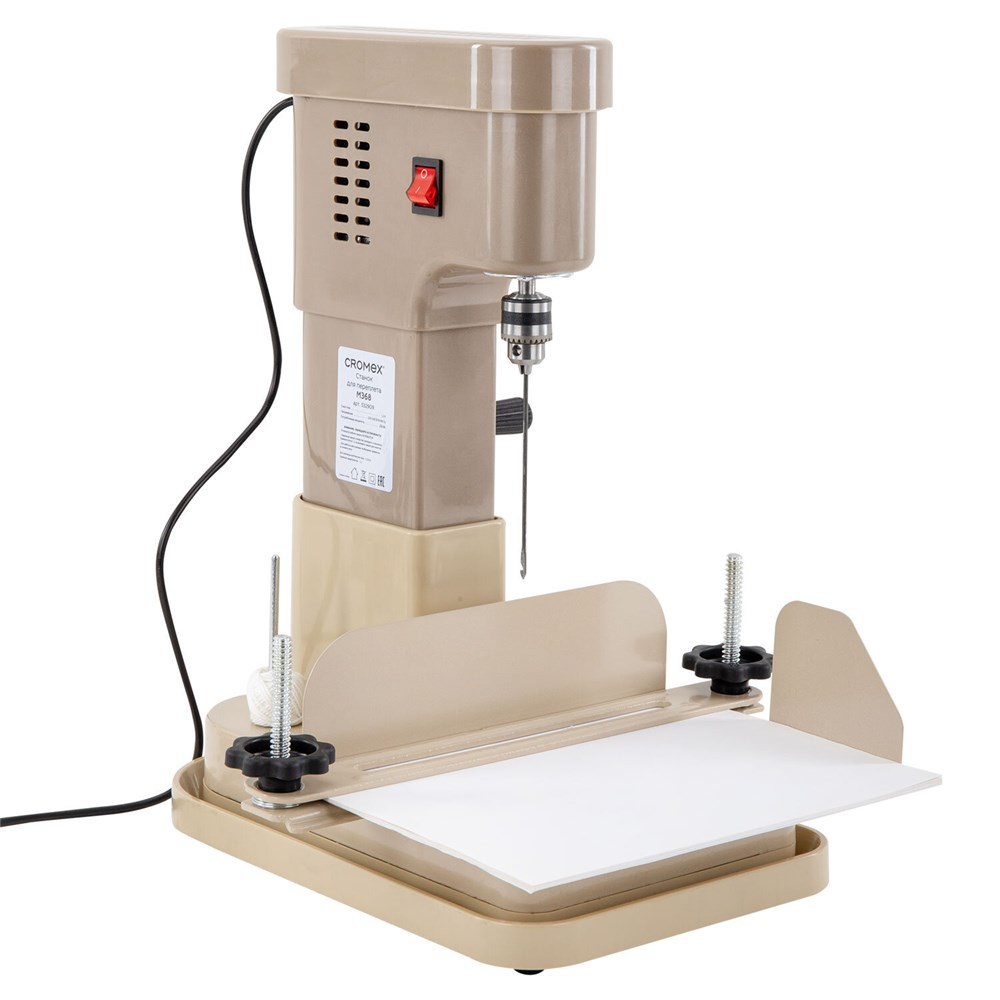 Станок для архивного переплета CROMEX "M368" – надёжное решение для обеспечения бесперебойного делопроизводства. Обеспечивает прочный и аккуратный переплёт на нить в соответствии с ГОСТ и законодательством. Идеален для офиса и архива.Принцип работы станка для архивного переплета документов CROMEX "M368" заключается в совмещении процесса сверления пачки бумаги (тома) с помощью шила с режущей кромкой и протягивания нити сквозь образовавшееся отверстие. При этом существует возможность использования обычного сверла диаметром 4-5 мм для сверления наиболее толстых папок и последующей прошивки пачки бумаги вручную с помощью иглы для переплетных работ. Использование данного переплетного оборудования повышает эффективность процесса сшива документов, а также позволяет экономить средства за счет переплета архивных документов без привлечения сторонних специалистов.