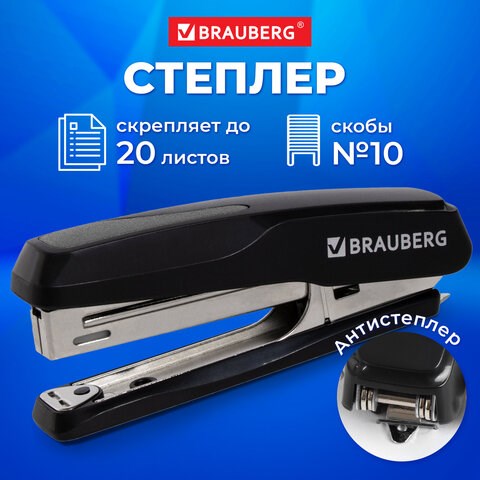 Степлер №10 BRAUBERG "Extra", до 20 листов, антистеплер, черно-серый, 229080