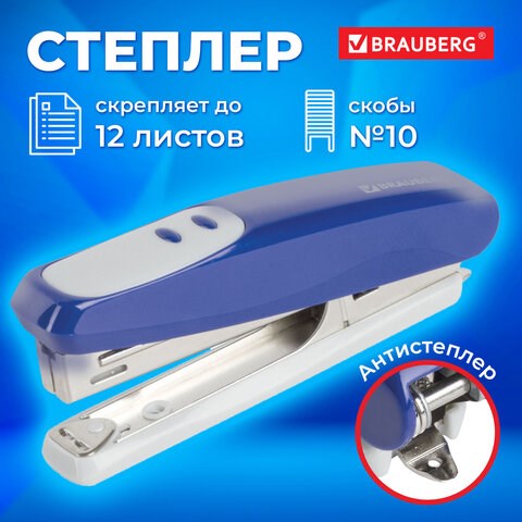 Степлер №10 BRAUBERG "Germanium", до 12 листов, с антистеплером, синий, ГАРАНТИЯ 5 ЛЕТ, 226569