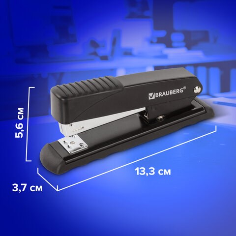)Настольный металлический степлер BRAUBERG «Office» с классическим дизайном обеспечит качественное скрепление документов.