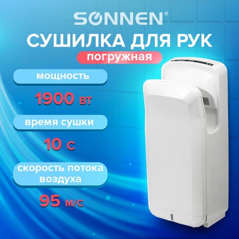 Сушилка для рук SONNEN K2, 1900 Вт, погружного типа, время сушки 10 секунд, пластик, белая, 604751