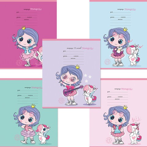 Тетрадь 12 л., ПЗБМ клетка, выборочный лак, "Девочки принцессы" (5 видов), 15762