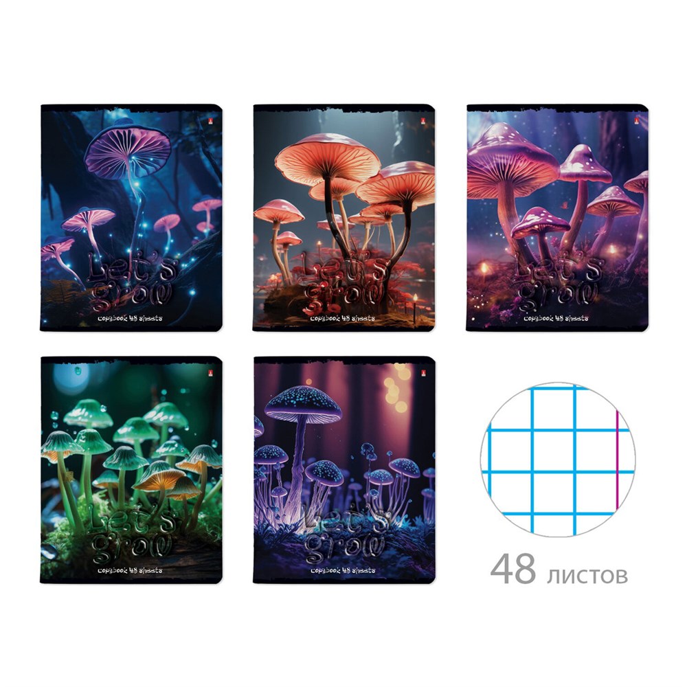 Тетрадь А5 48 л. АЛЬТ скоба, клетка, глянцевый лак, "Грибы фэнтези" (5 видов), 7-48-1332