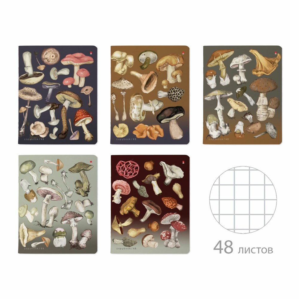 Тетрадь А5, 48 л., АЛЬТ скоба, клетка, матовая ламинация, "Грибная феерия" (5 видов), 7-48-1325