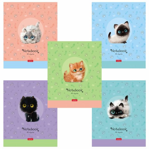 Тетрадь А5 48 л. HATBER скоба, клетка, обложка картон, "Кошарики" (5 видов в спайке), 48Т5В1