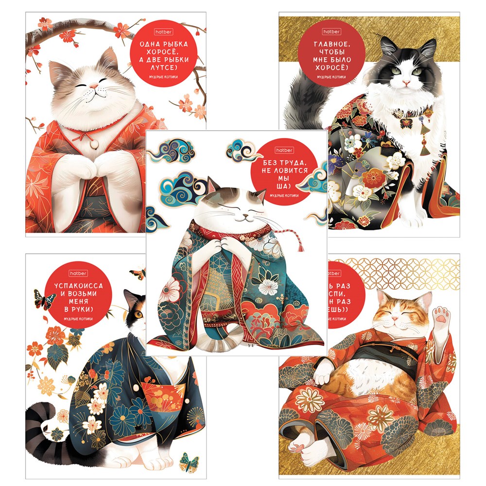Тетрадь А5 48 л., HATBER скоба, клетка, обложка картон, "Мудрые котики" (микс в спайке), 088362, 48Т5В1