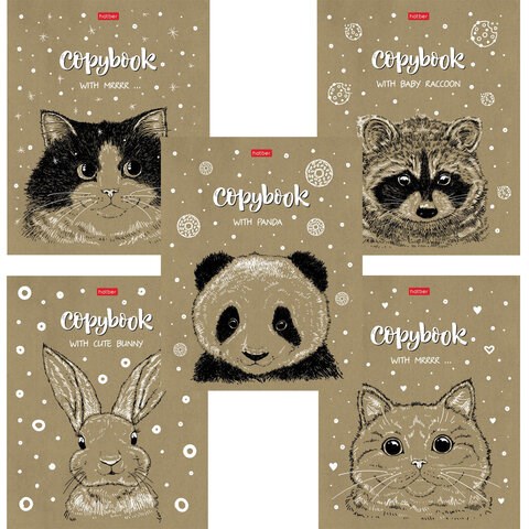 Тетрадь А5, 48 л., HATBER, скоба, клетка, обложка крафт-картон, "Милые зверьки" (5 видов в спайке), 48Т5В1