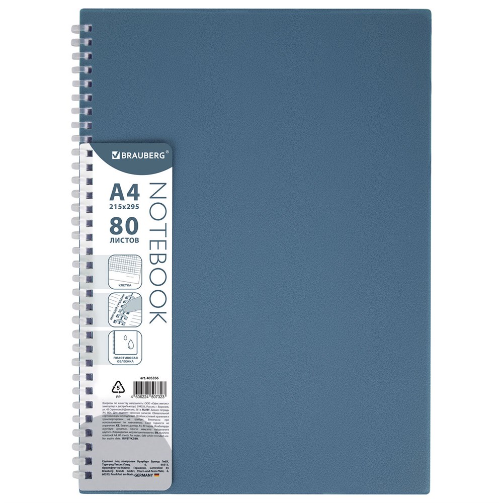 Тетрадь обложка пластик, А4 80 л., гребень мягкий (силиконовый), клетка, BRAUBERG, синий, 405356