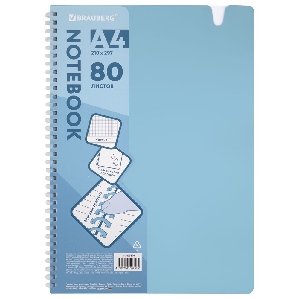 Тетрадь обложка пластик, А4 80 л., гребень мягкий, вырубка для ручки, клетка, BRAUBERG, голубой, 405370