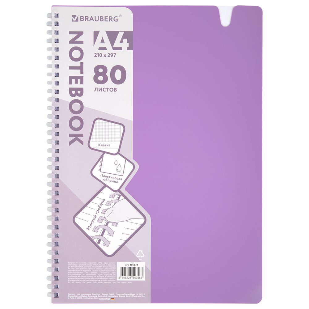 Тетрадь обложка пластик, А4 80 л., гребень мягкий, вырубка для ручки, клетка, BRAUBERG, сиреневый, 405374