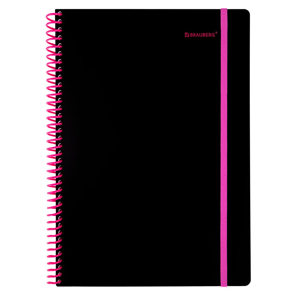 Тетрадь обложка пластик, А4 80 л., спираль пластик, резинка, клетка, BRAUBERG, черный/розовый, 405380