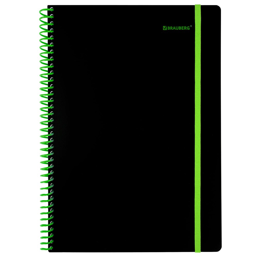 Тетрадь обложка пластик, А4 80 л., спираль пластик, резинка, клетка, BRAUBERG, черный/зеленый, 405383