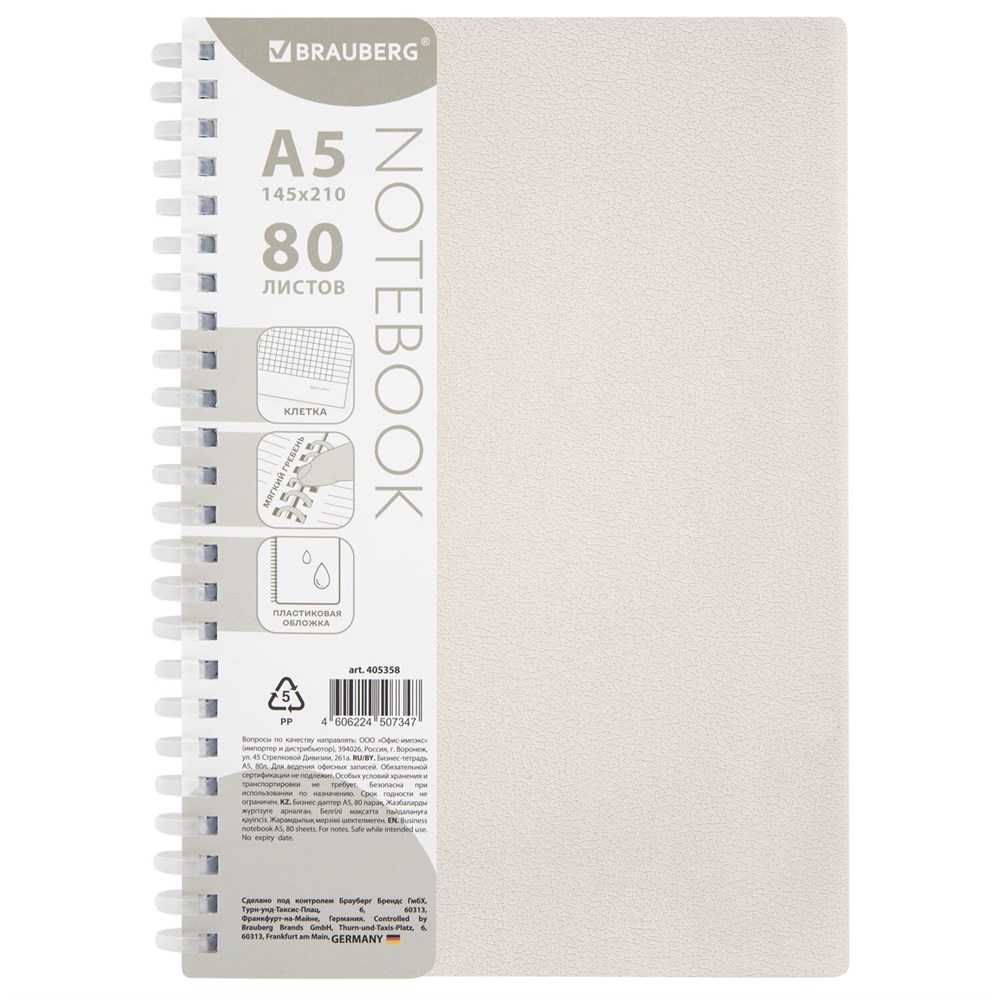 Тетрадь обложка пластик, А5 80 л., гребень мягкий (силиконовый), клетка, BRAUBERG, бежевый, 405358
