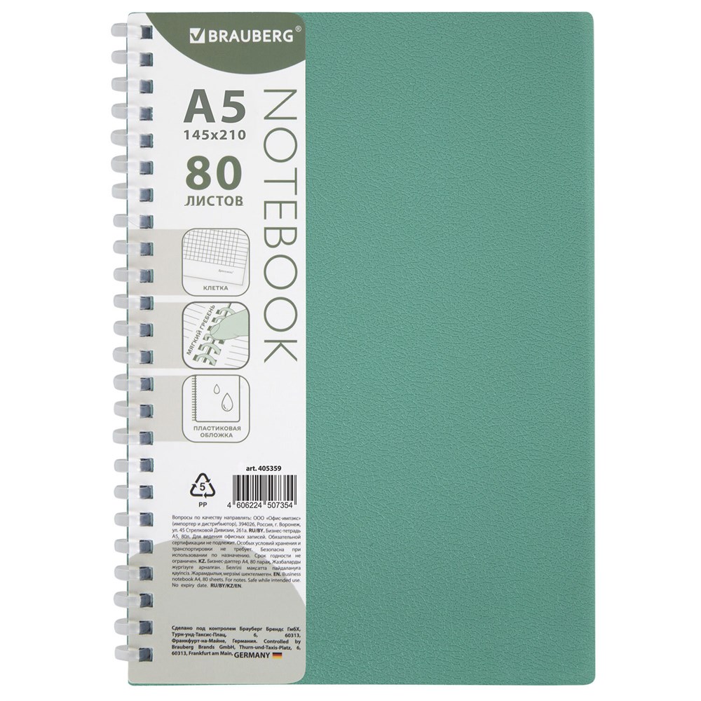 Тетрадь обложка пластик, А5 80 л., гребень мягкий (силиконовый), клетка, BRAUBERG, зеленая, 405359