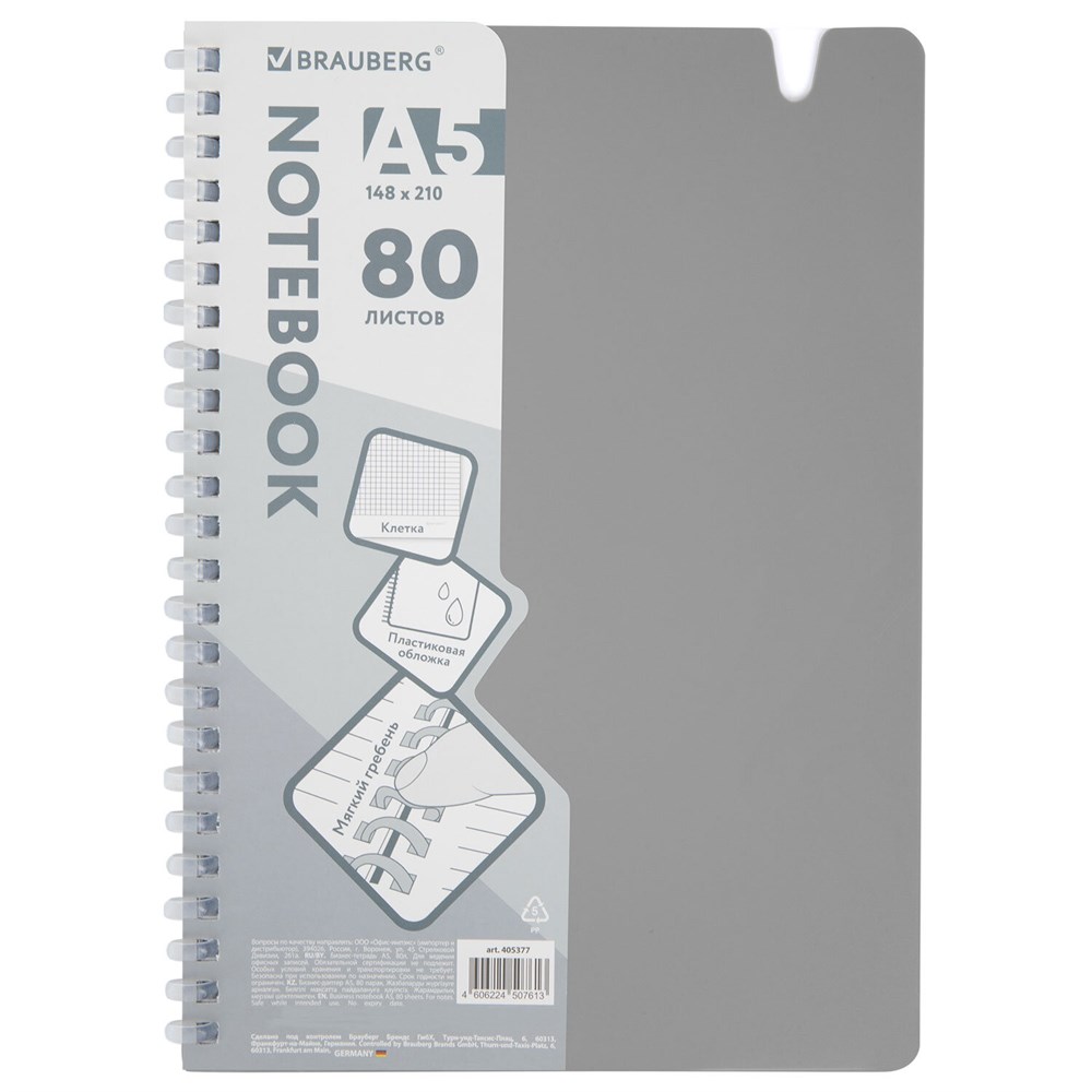 Тетрадь обложка пластик, А5 80 л., гребень мягкий, вырубка для ручки, клетка, BRAUBERG, серый, 405377