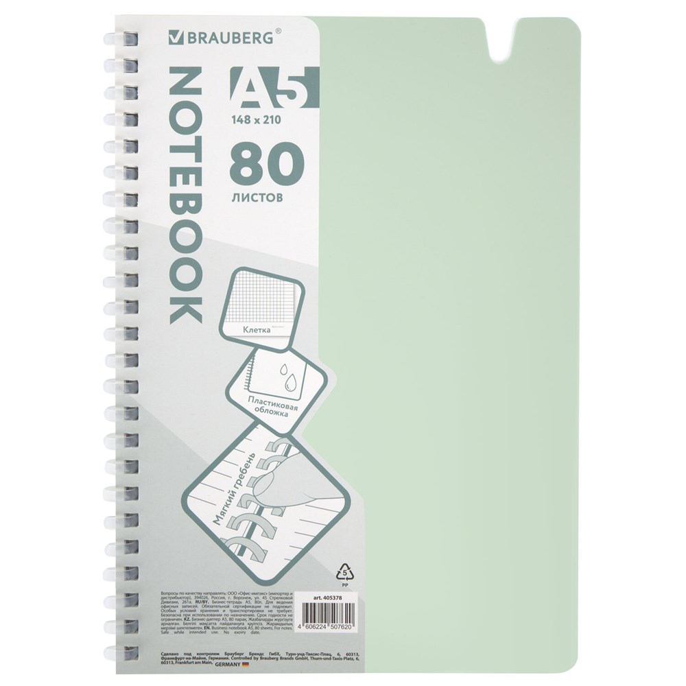 Тетрадь обложка пластик, А5 80 л., гребень мягкий, вырубка для ручки, клетка, BRAUBERG, светло-зеленый, 405378