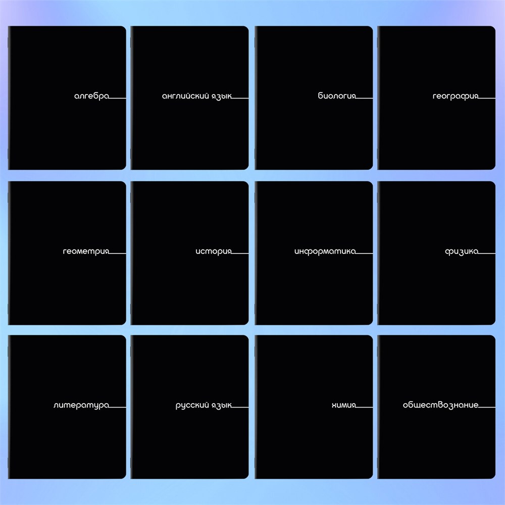 Предметные тетради BRAUBERG из серии "BLACK" со справочным материалом предназначены для учащихся средних и старших классов.В комплекте 12 тетрадей: Алгебра, Английский язык, Биология, География, Геометрия, Обществознание, История, Информатика, Литература (в линию), Русский язык (в линию), Физика, Химия.