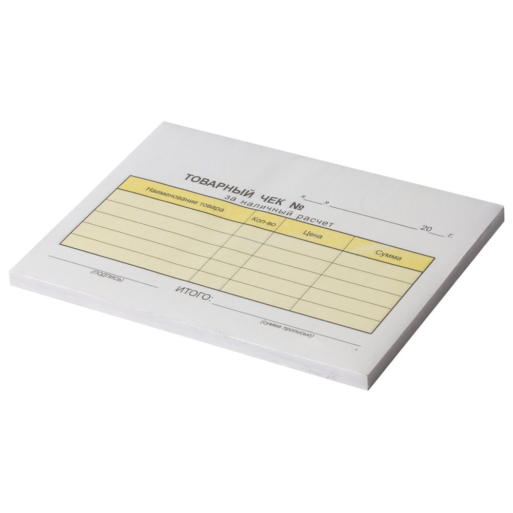 Каждая книжка состоит из 50 склеенных 2-слойных бланков, в упаковке 5 книжек. Упакованы в термоусадочную пленку.