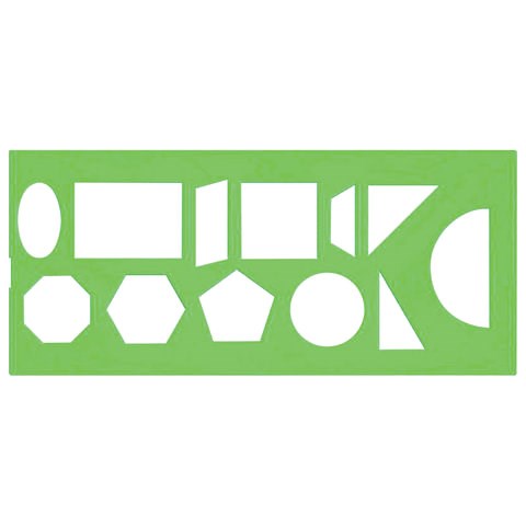 )Трафарет из прочного пластика, предназначенный для черчения различных геометрических фигур. Прямоугольная форма корпуса. Трафарет содержит 12 элементов. Необходим школьникам, студентам, учителям на уроках геометрии и стереометрии.