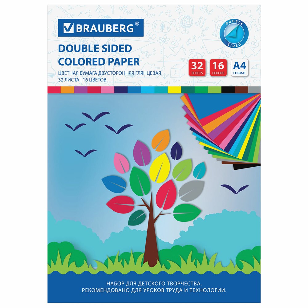 Цветная бумага А4 2-сторонняя мелованная, 32 листа 16 цветов, на скобе, BRAUBERG, 200х280 мм, "Деревце", 113537