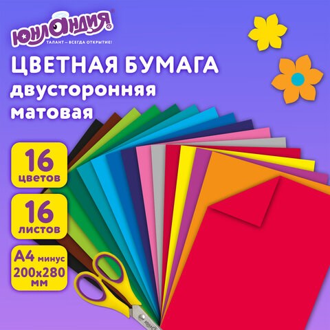 Цветная бумага А4 2-сторонняя офсетная, 16 листов 16 цветов, на скобе, ЮНЛАНДИЯ, 200х280 мм, Олененок, 111326