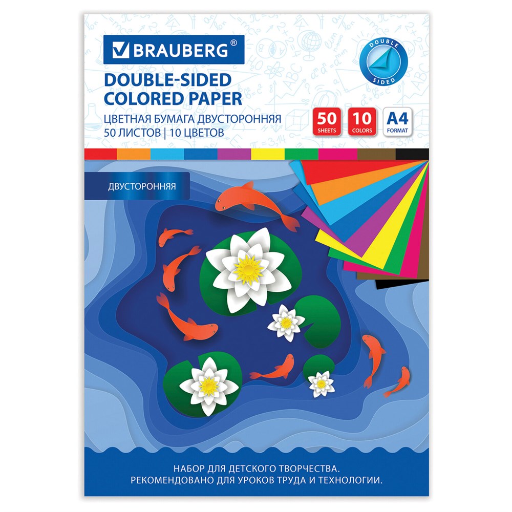 Цветная бумага А4 2-сторонняя офсетная, 50 листов 10 цветов, в папке, BRAUBERG, 200х280 мм, "Рыбки", 115170