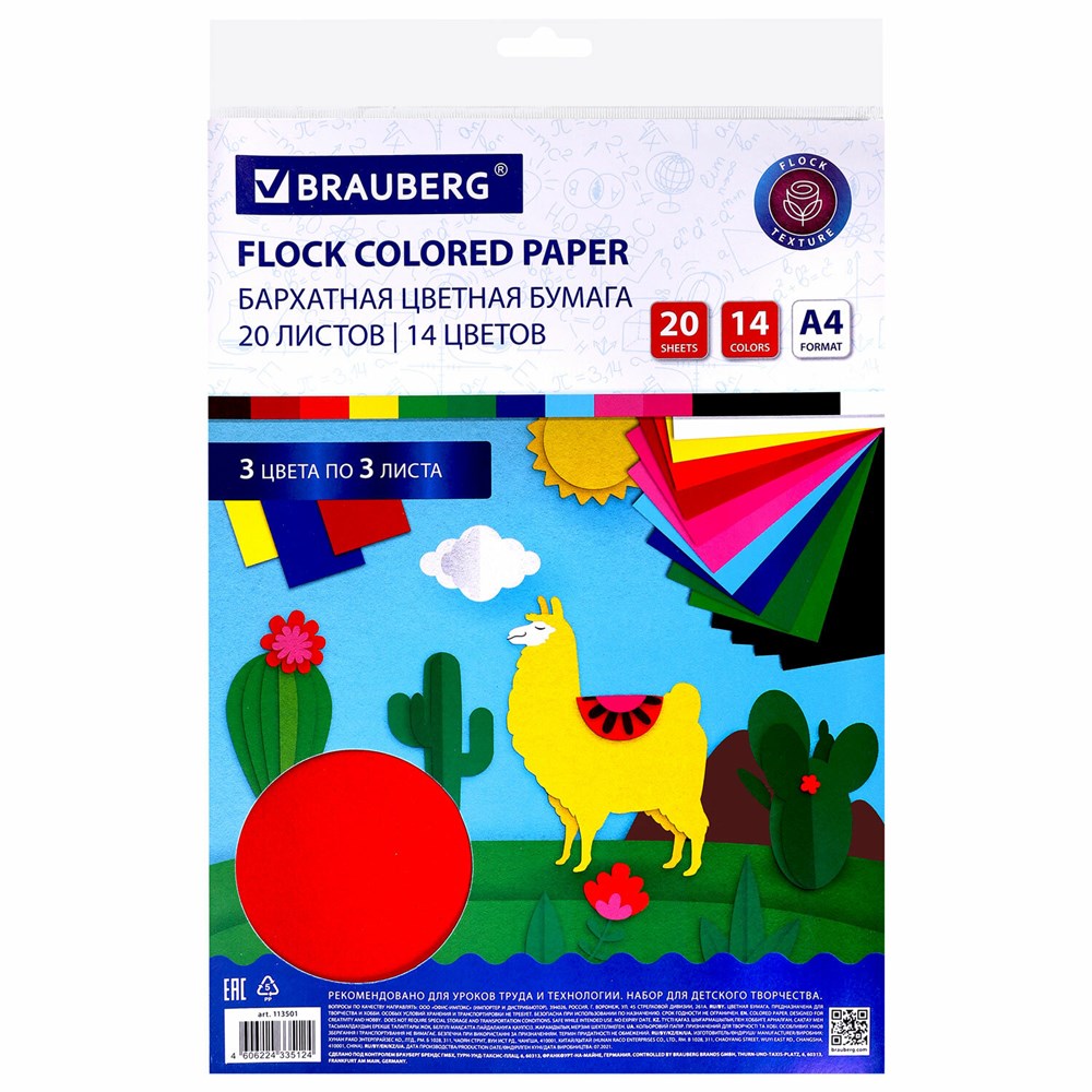 Цветная бумага А4 БАРХАТНАЯ, 20 листов 14 цветов, 110 г/м2, BRAUBERG, 113501