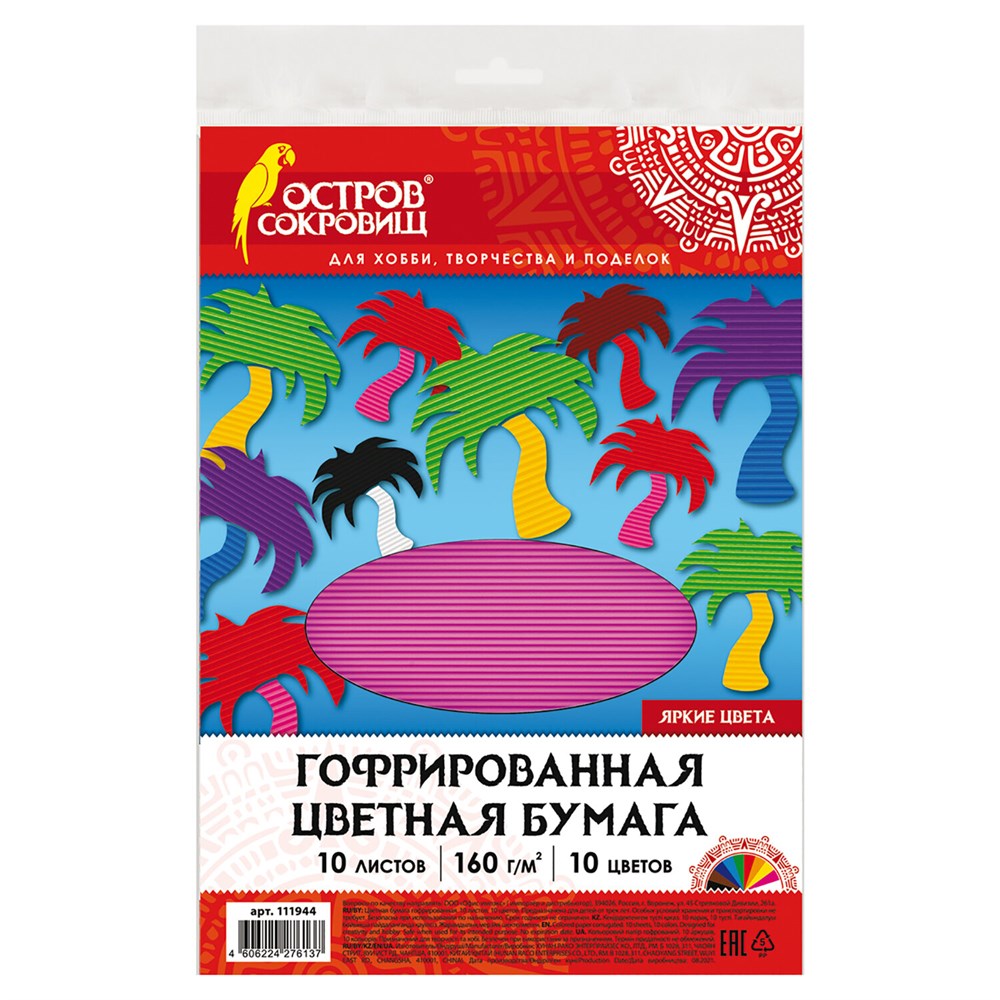 Цветная бумага А4 ГОФРИРОВАННАЯ ДВУСТОРОННЯЯ, 10 листов 10 цветов, 160 г/м2, ОСТРОВ СОКРОВИЩ, 210х297 мм, 111944
