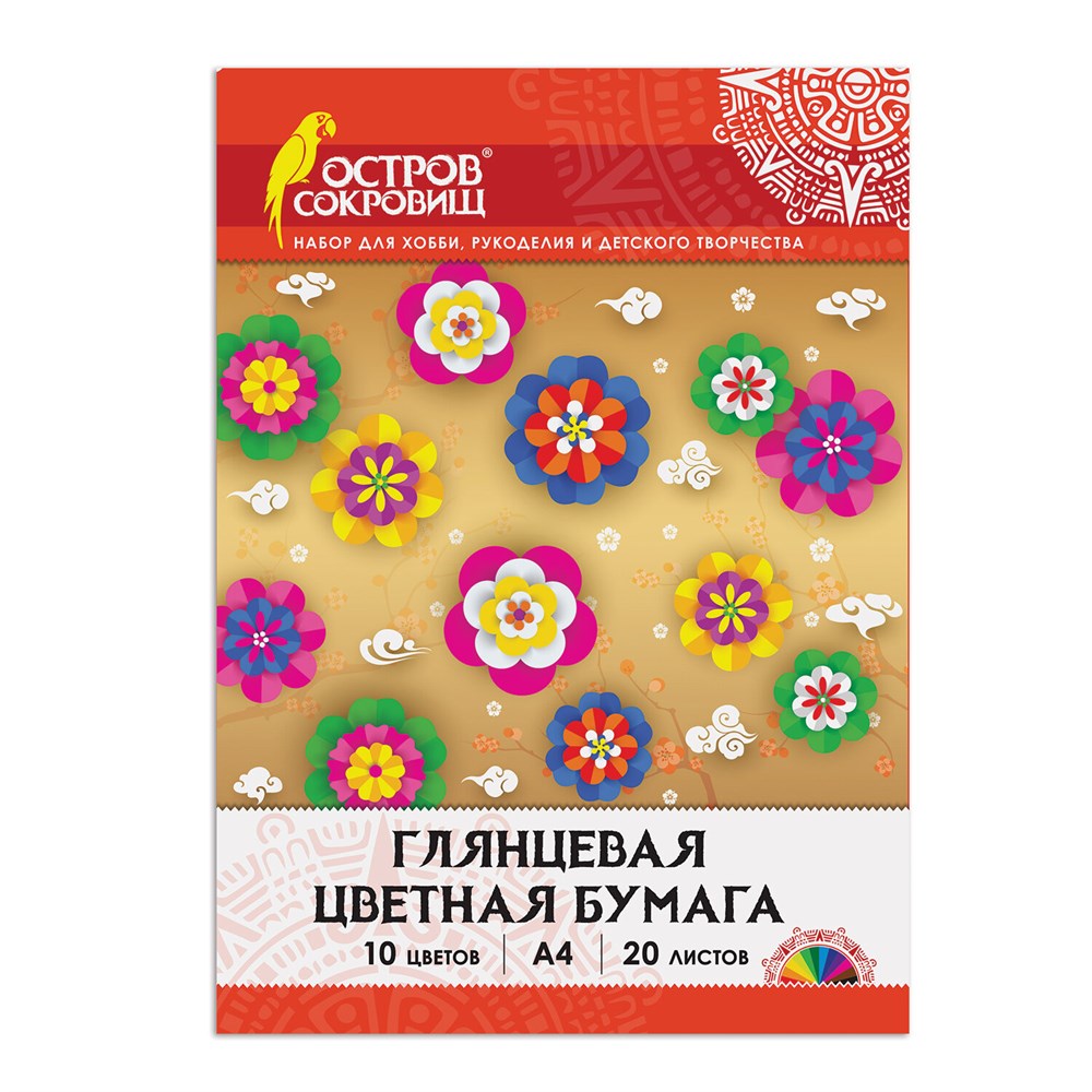 Цветная бумага, А4, мелованная (глянцевая), 20 листов 10 цветов, в папке, ОСТРОВ СОКРОВИЩ, 200х280 мм, 129554