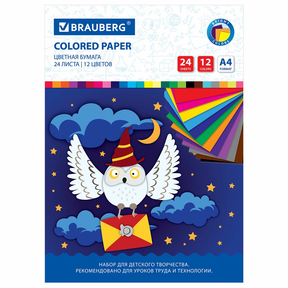 Цветная бумага А4 офсетная, 24 листа 12 цветов, на скобе, BRAUBERG, 200х280 мм, "Сова", 115489