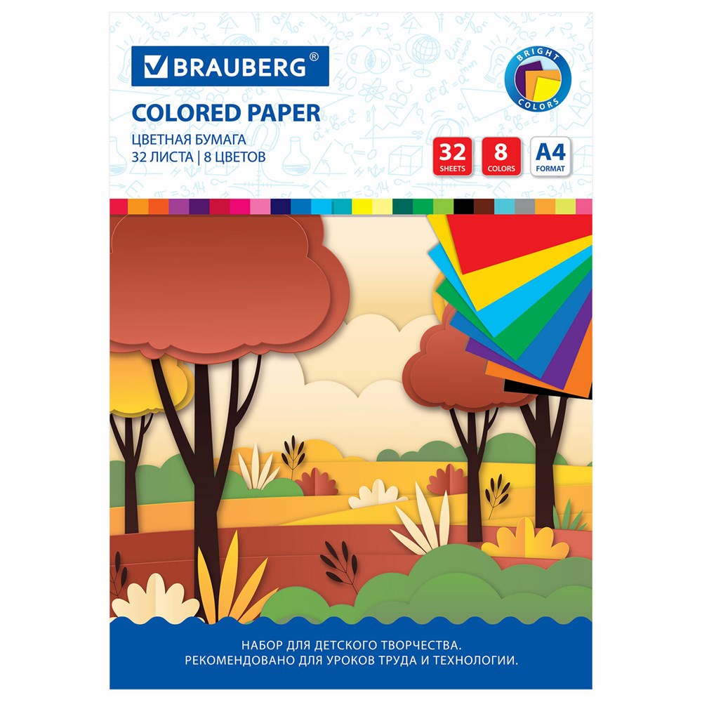Цветная бумага А4 офсетная, 32 листа 8 цветов, на скобе, BRAUBERG, 200х280 мм, "Роща", 115490