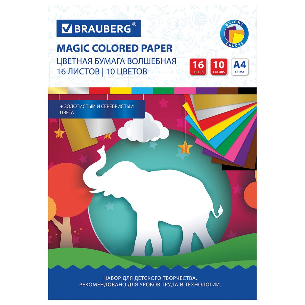 Цветная бумага А4 офсетная, ВОЛШЕБНАЯ, 16 листов 10 цветов, на скобе, BRAUBERG, 200х275 мм, "Чудеса", 129921