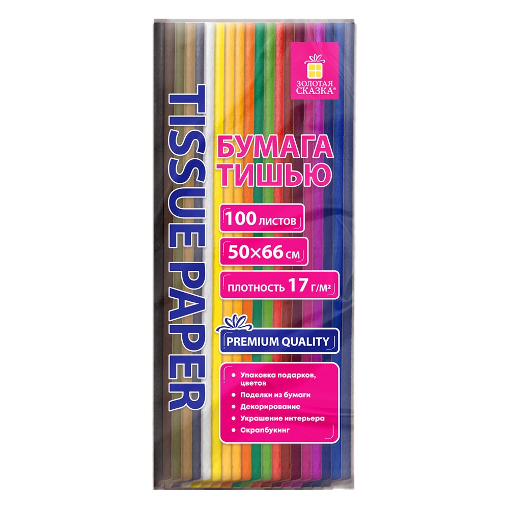 Цветная бумага ТИШЬЮ 17г/м2, 50х66см, 100 листов 20 цветов интенсив ассорти, ЗОЛОТАЯ СКАЗКА, 116496