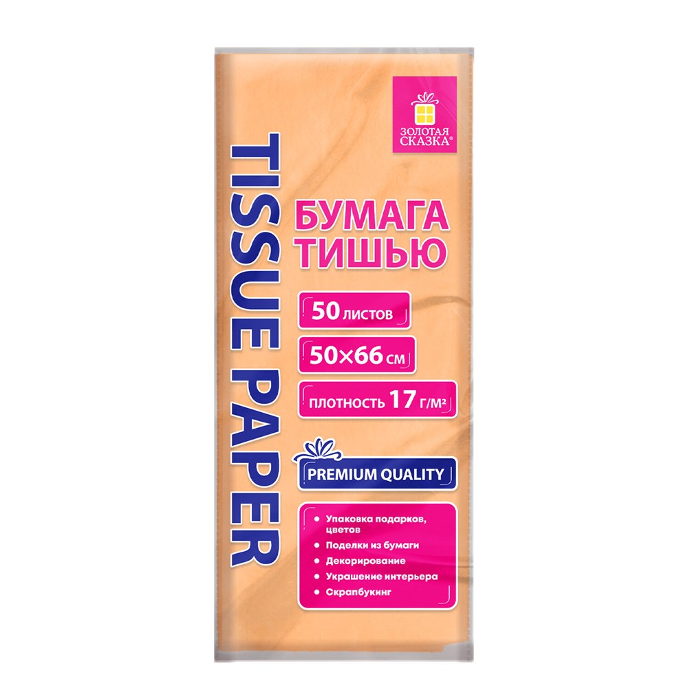Цветная бумага ТИШЬЮ 17г/м2, 50х66см, 50 листов пастель персиковый, ЗОЛОТАЯ СКАЗКА, 116489