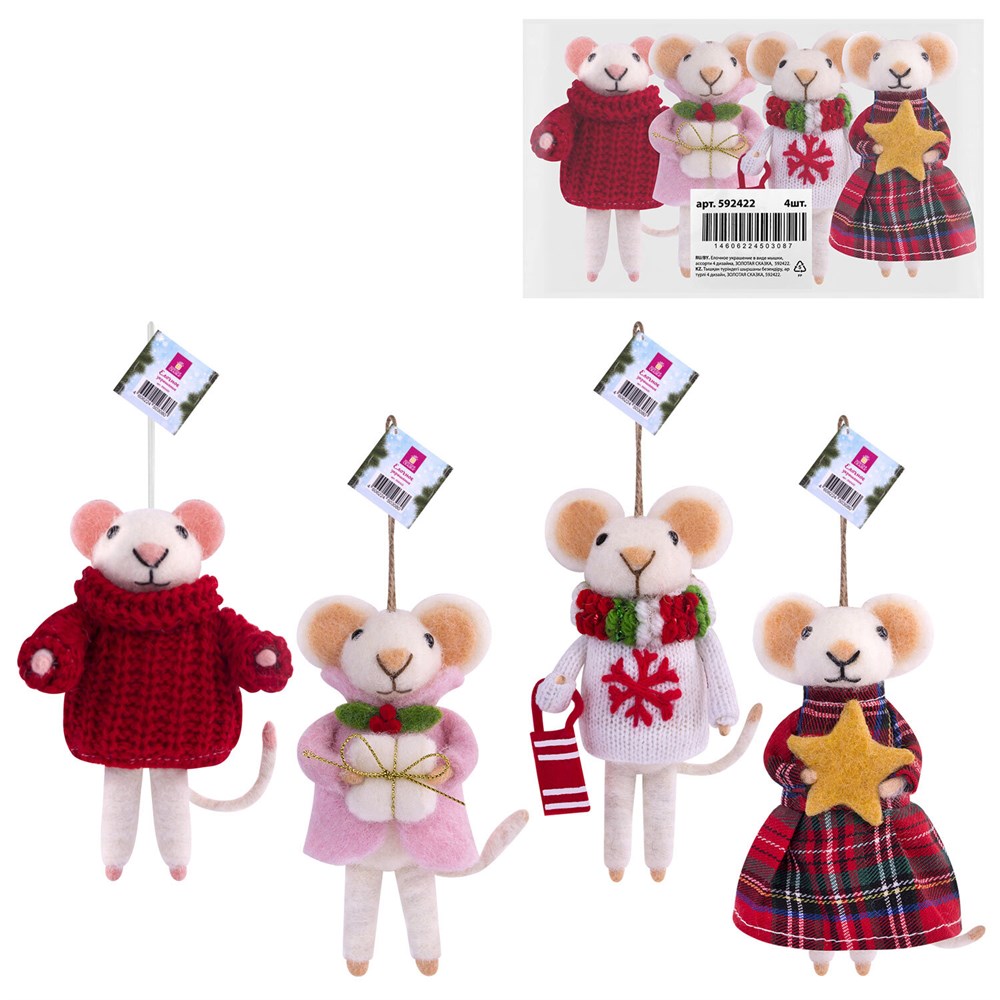 Украшение ёлочное (1 шт.) "Мышка", 6х5х13 см, фетр, хлопок, ассорти 4 дизайна, ЗОЛОТАЯ СКАЗКА, 592422
