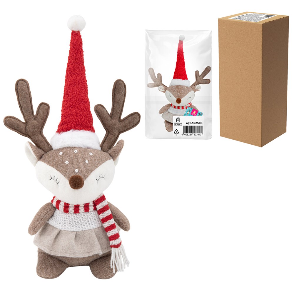 Оленёнок упакован в пакет с клейким краем и в гофрокороб. Материал – полиэстер, дерево. Размер – 40 см.