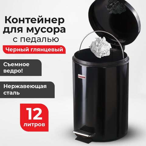 Ведро мусорное с педалью 12 литров "Classic", ЧЕРНОЕ ГЛЯНЦЕВОЕ, металлическое, со съемным внутренним ведром, LAIMA, 602850