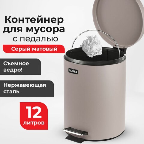 Ведро мусорное с педалью 12 литров "Classic", СЕРОЕ МАТОВОЕ, металлическое, со съемным внутренним ведром, LAIMA, 604944