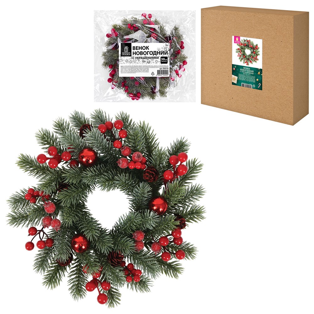 Венок новогодний заснеженный, диаметр 30 см "Зимняя сказка", с декором, литой ПЭТ, ЗОЛОТАЯ СКАЗКА, 592518