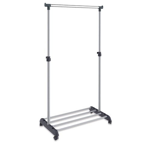 )Многофункциональная передвижная гардеробная вешалка. Помимо традиционной штанги для плечиков, оснащена полками для обуви и боковыми крючками для сумок, зонтов и головных уборов. Имеет колесную опору.